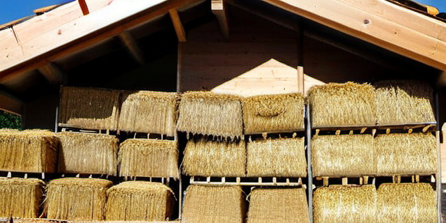 Солома — это побочный продукт сельского хозяйства, обладающий низкой теплопроводностью, доступностью и натуральностью. Она служит отличным теплоизолятором и одновременно позволяет «дышать» стенам дома, что снижает риск появления плесени и грибка.